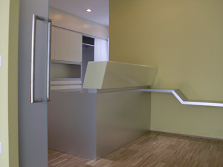 In einem neu errichteten Wohnhaus wurden die ebenerdig befindlichen Ordinationsräume einer gynäkologischen Praxis ausgebaut. Anforderung war eine helle freundliche Atmosphäre zu schaffen und den Patientenablauf vom Empfang über die Wartezone zu den Behandlungsräumen so zu gliedern, dass einerseits Blickkontakt zwischen Empfang und Warteraum gegeben ist und andererseits eine gewisse Intimität für Gespräche möglich ist. Ähnliches gilt auch für die Behandlungsräume.