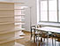 In einen 64m² großen und 5,2m hohen Raum mußte eine Raumteilung zwischen Arbeits- und Besprechungsraum mit Bibliotheksnutzung erfolgen. Ein freistehender Raumteiler übernimmt Sichtschutz und Bibliotheksfunktion und erlaubt den Raum weiterhin als Ganzes wahrzunehmen.