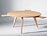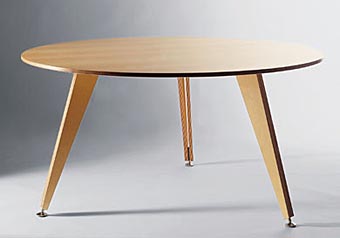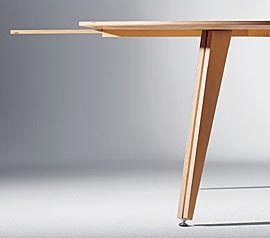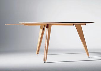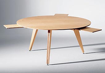 dreibeiniger Tisch aus Sperrholz-Platten, Tischbeine abschraubbar, erweiterbar um 3 Auszugplatten