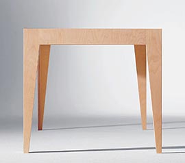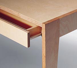 Tisch aus Sperrholzplatten mit zwei Schubladen und Kabeltrasse