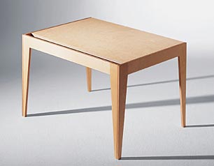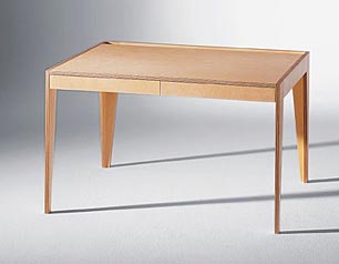 Arbeitstisch mit zwei Schubladen und einer Kabeltrasse mit Auslässen für Kabel an den hinteren Tischbeinen. Der Tisch ist vor allem im privaten Bereich, etwa in einem Wohnzimmer oder Kinderzimmer einsetzbar.